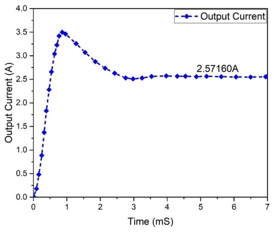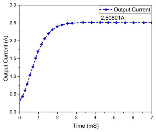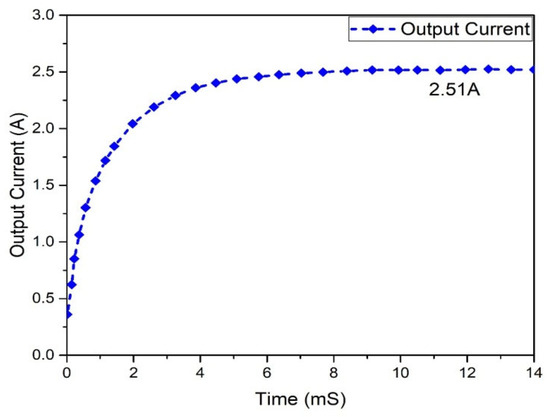 The current of the Flyback boost converter that flows across the load is 2.57160 A, as shown in Figure 9. During one switching interval, the load current was also studied. The load, 70% current, was caused by energy delivered to the load via the transformer and through a pair of diodes. The discharge of the capacitor causes the current of the load via the load during the overlapping period. Since both MOSFETs in each current-fed input circuit were conducting throughout the overlapping period, there was no voltage across the transformer windings because no current was flowing through the transformer’s primary windings.