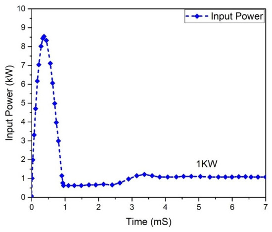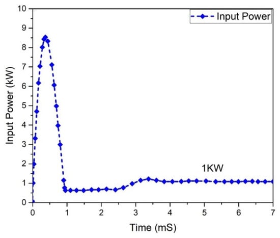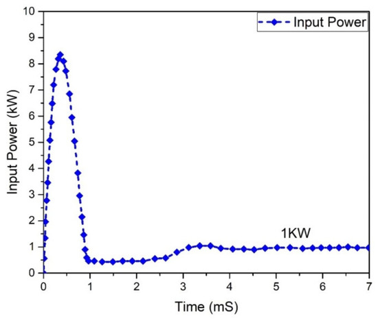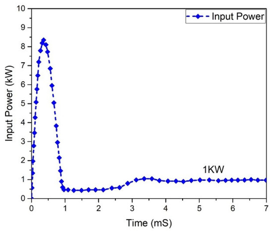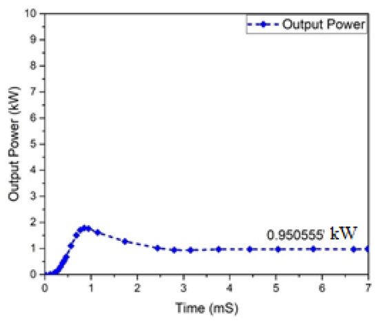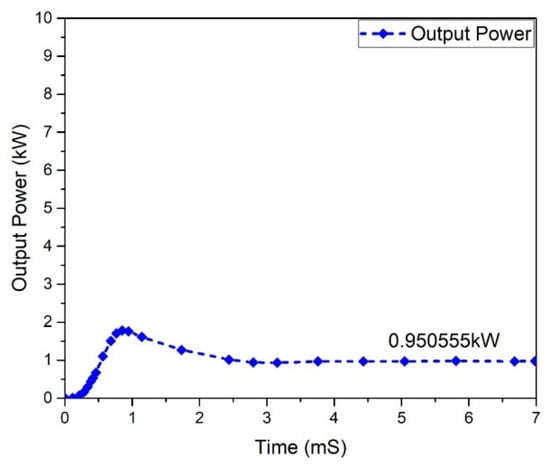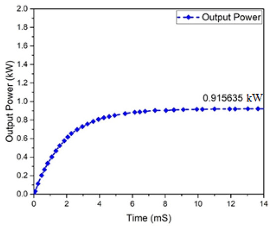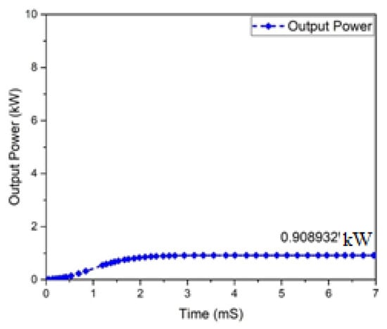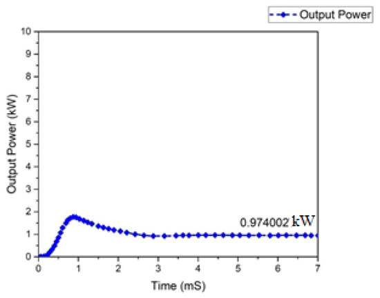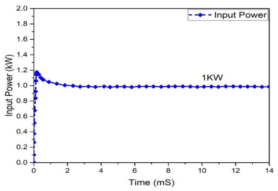 Input and output power graphs are shown in Figure 10 and Figure 11. The graph behavior illustrates that the value of the output power was almost 0.950555 W, while the input power value was 1 kW.