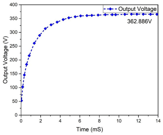 Flyback boost, simple boost, and interleaved boost converters were used for low-voltage, high-power renewable energy systems. These converters offer high step-up conversion ratios, high efficiencies, and low switch voltage stresses. They may produce a high output voltage from common voltage sources such as solar arrays and fuel cells. The output voltages and powers waveforms and switch currents and voltages waveforms of the three converters were obtained after successful converter circuit simulation in OrCAD PSpice. The goal was to prove which converter is superior for low-voltage high-power applications in terms of voltage conversion ratio, efficiency, and switch stresses. At the end of the article, Table 1 and Table 2 summarize the simulated converters. Figure 7 depicts the output voltage waveform of the proposed Flyback boost converter. This waveform shows a voltage output of 371.583 V.