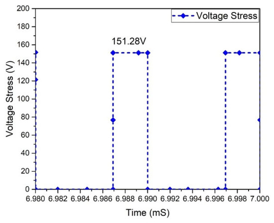 The silicon area is reduced when overall switch stress is minimized. During Mode 1 and Mode 3, the peak voltage across switches is identical to the actual voltage of the transformer, which is the reflection of the voltage of the load. The stress can be expressed [36,37,38,39,40] as: