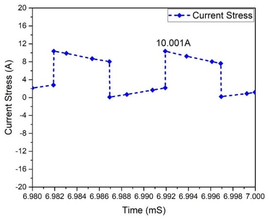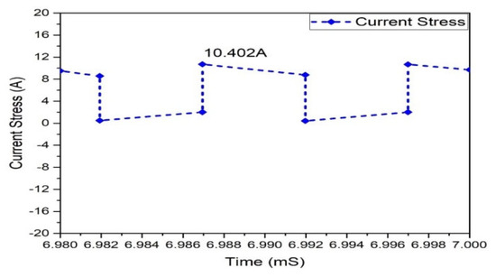 At this stage of operation, Modes 3 and 1 are observed, and it has been found that in the case of the Flyback boost converter, the value of the peak voltage crosswise the MOSFET appears. The MOSFETs used in the converter must tolerate the high peak voltages. MOSFET voltage waveforms are shown in Figure 25. The Flyback-based converter represents the voltage stress of 151.284 V across all MOSFETs. In a Flyback-based converter, the maximum current via a MOSFET occurs in Modes 1 and 3. This is significant because the MOSFETs used in the converter must withstand the maximum current stress. Current stress waveforms in MOSFETs are shown in Figure 26. It shows that each MOSFET has the current stress of 10.310 A.