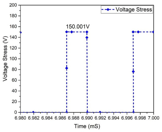 In the operational stage in Modes 1 and 3 of a Flyback-boost converter, the maximum voltage is passed across the HEMT; thus, the HEMTs converters must be able to tolerate peak voltages. Voltage waveforms of HEMTs are shown in Figure 29, which offers a voltage stress of 150 V across all HEMTs in the Flyback-based converter.