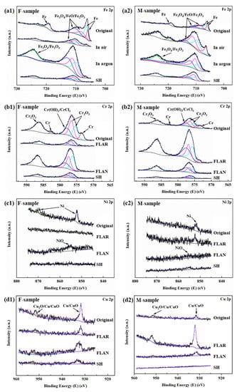 Figure 8 shows the XPS spectra of the passivation films on different samples. The peak spectra, such as Fe2p, Cr2p, Ni2p, Cu2p, Nb3d, and C1s, were fitted to investigate the surface components. The Fe2p spectra of the eight samples show seven peaks around 706.5 eV, 706.9 eV, 708.1 eV, 709.1 eV, 711.5 eV, 718.9 eV, and 723.7 eV, which are related to Fe, FeO/Fe2O3, and Fe3O4. The Cr2p spectrum has six peaks around 573.9 eV, 575.4 eV, 576.1 eV, 577.4 eV, 583.5 eV, and 586.4 eV, which are related to Cr, Cr2O3, and CrCl3/Cr(OH)3. The Ni2p spectrum contains three peaks around 851.8 eV, 855.0 eV, and 869.9 eV, corresponding to Ni, NiO, and Ni. Two peaks around 933.2 eV and 952.7 eV can be observed in the Cu2p spectra, corresponding to Cu/CuO and Cu2O/Cu/CuO. There are three peaks in the Nb2p spectrum, namely, 202.4 eV, 207.2 eV, and 209.5 eV, which are associated with NbO, NbO/Nb2O5, and Nb2O5. The C1s spectrum has four peaks around 284.8 eV, 285.6 eV, 286.5 eV, and 588.6 eV, which are related to C.