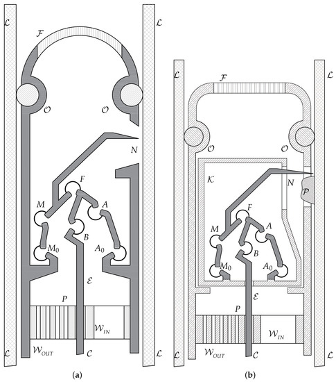 Figure 4a shows a possible configuration for endovascular surgery applications. The layout is intended to be used at technology readiness level (TRL) 4, which implies the validation of the device components in the laboratory. For this reason, this layout is illustrated without the packaging case. The image represents a cross-sectional view of a lumen where the head of a catheter has been introduced. An O-ring is mounted for sealing the fluid and for preventing any embolus to travel in the arterial flux. Furthermore, a filter is positioned on the top of the capsule for the same reason, without blocking the normal blood flow. The six elastic joints can be designed either as flexible beams with circular axis or as conjugate surface flexure hinges (CSFHs) [38,55,56], and are represented in the figure by the centers , M, F, B, A and of the elastic joints, whereas P represents the seventh kinematic pair that consists of a prismatic pair used to pull the input element attached to the remote control cable .