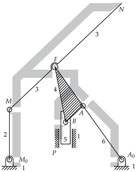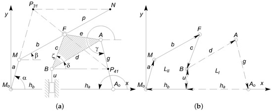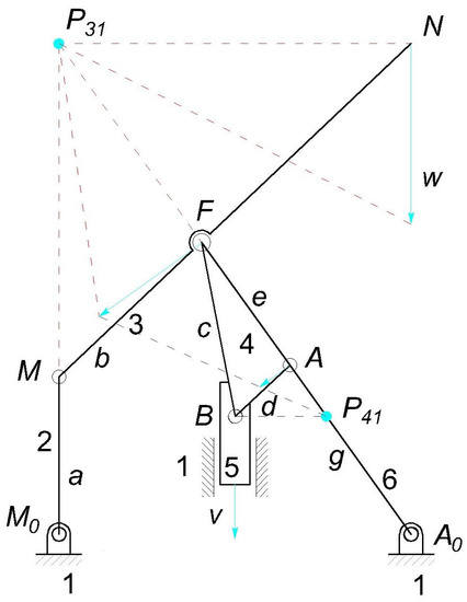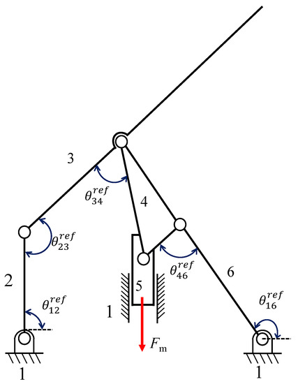 where the numbers m and ℓ of kinematic pairs and links are 7 and 6, respectively. For plane [57] mechanisms, provided that they present no partial mobility [58], two independent vector equations can be written by means of which four unknown angles can be calculated, once the input displacement is assigned.