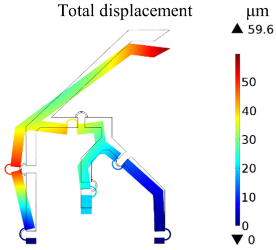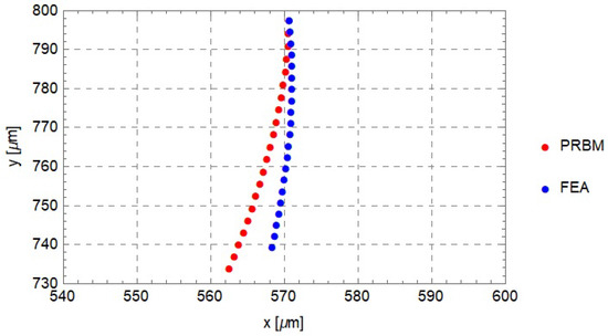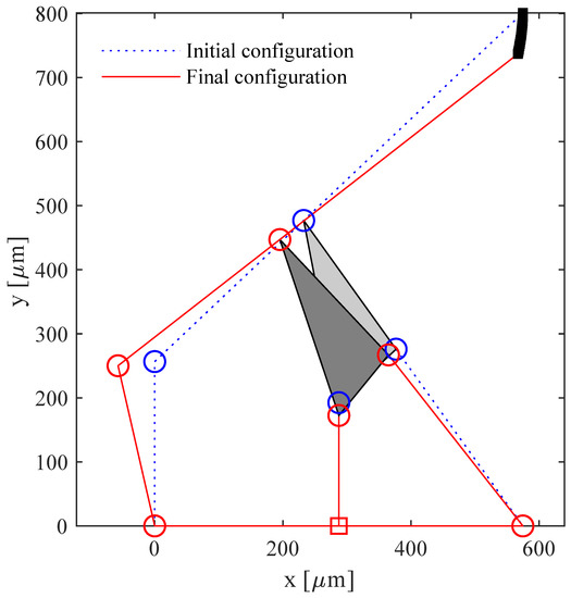 By using the parameters illustrated in Figure 6 and listed in Table 1, the motion of the PRBM was replicated for decreasing values of the input displacements . Figure 8 shows the neutral and the deformed configurations obtained for displacements from to m of point B.