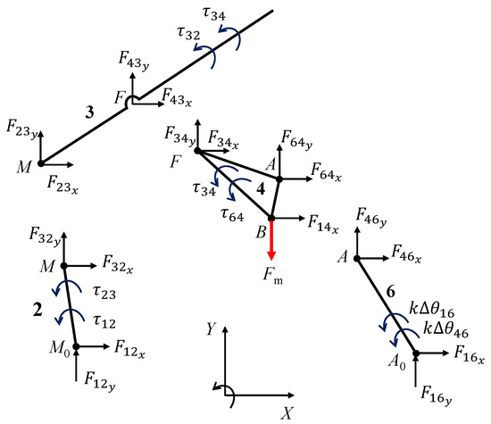 - The second task is simply carried out by calculating the reaction forces at the i-j revolute pair, and their x and y components, and , respectively, by means of a simple inverse dynamic analysis of the PRBM.