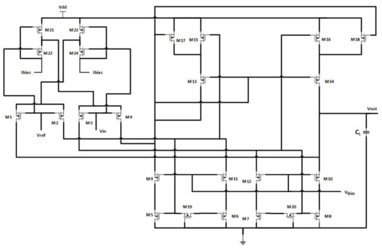 The structure for the amplifier proposed by Devi et al. [] is represented in Figure 1. The structure uses an adaptive biasing technique in a modified recycling folded design. The transistors M15 and M16 additionally contribute to the input drive, along with M5 and M6. To do this, a crossover link is set up between M6–M15 and M7–M16. The transistors M17 and M18 are included in the design to make it a single-ended structure, such that a current of flows through it. All the devices in the structure operate in weak inversion regions [,]. Whenever a substantial signal is employed into Vref, the transistors M1 and M2 are turned off, and M4 will function in the deep triode region of the weak inversion. The bias current conducting through M3 is imaged by k and (k − 1) into M9 and M10, and then into the load capacitor CL by M17 and M18. The design shows improvement in slew rate as it is multiplied by a factor of (2k − 1) than the conventional structures []. There is an overall increase in transconductance, gain bandwidth product, and slew rate. Higher values of k lead to the degradation of the phase-margin in the design and make it unstable. To avoid this, compensation resistors realized by transistors Mc1 and Mc2 working in deep triode regions are inserted between the gates of the current mirror [].