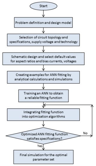 The approach shown by the flowchart in Figure 2, where the ANN serves as an approximate replacement for analytical equations or circuit simulations used to calculate the cost function formula, is also suitable for combinations of ANN fitting functions and metaheuristic algorithms. The main advantage of using an ANN in that case is in its speed, and it is, thus, most practical for higher complexity circuits and circuit models. Fitting functions are simple and suitable for calculations scaled for a greater or more dense parameter space. It is possible that the parameter set delivered by using metaheuristic algorithms, after the final simulation, can lead to a circuit with a greater area than that obtained by parameter sets delivered by the goal attainment method (or any other method based on the deterministic search).