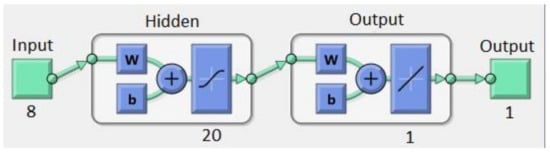 The artificial neural network that we used for fitting the relation between the overall circuit area and the eight related parameters was a shallow forward-feed backward propagation network whose structure is shown in Figure 4. Since the dataset has overall 150 examples, the proposed ANN is shallow, having a single hidden layer. In the case of a greater number of available datasets, a deep structure, one with several hidden layers, may be used []. The way to seek for the best ANN configuration, for a predefined list of device variables, inputs, and outputs, is by adding more hidden layers (and applying the deep learning techniques []), by changing the number of neurons in hidden and output layers, or by changing the activation function. Among various possible activation functions, the Sigmoid Symmetric Transfer Function was used in this work: