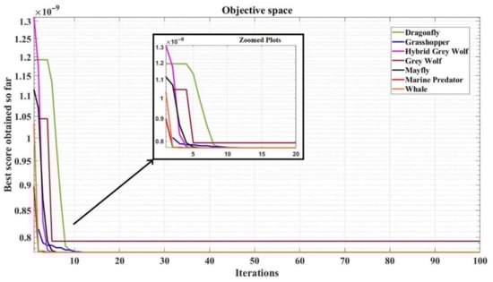 The convergence plots for the algorithms, namely DOA, GOA, PSOGWO, GWO, MOA, MPOA, and WOA, are shown in Figure 5. The MPOA algorithm converges at a fastest rate, close to about an iteration number of 3. A majority of the algorithms used have been developed recently to assure a better convergence speed.