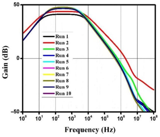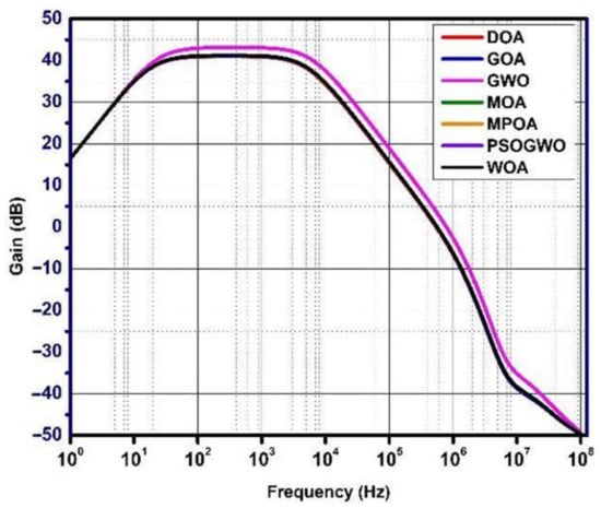 In this work, it could be observed from the results that the ANN-assisted goal attainment method has outperformed the metaheuristic algorithms. The MPOA algorithm has shown the best value for area, which comes around 773.6955 µm2, and provides a gain and phase of 41.255 dB and 61.96 degrees. In contrast to the metaheuristic optimization methods, the ANN-assisted goal attainment method provided better results. Based on the comparative analysis among the presented methods, it can be observed that the results in Set 4 show an improvement in terms of gain, power, and area. The goal to minimize the objective function (area) is achieved with better outcomes by the ANN-assisted goal attainment. A comparison of the results is shown in Table 8.