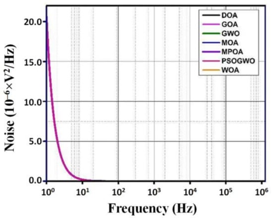 An operational transconductance amplifier (OTA) in the preamplifier circuits needs to be properly scaled in order to meet the design target and specifications []. The traditional sizing process of MOSFETs [] is time-consuming, laborious, and depends on human expertise. Thus, alternative methods that are robust and reliable, such as meta-heuristic optimization techniques, have gained popularity in solving complex circuit design problems [,]. Vural et al. [] and Motlak et al. [] have implemented particle swarm optimization (PSO) to minimize the area in a two-stage op-amp and power in a self-biased folded cascode. Moreover, there are other reported works, such as that by Kudikala et al. [], where the harmony search algorithm (HS) and differential evolution (DE) algorithm were applied for error minimization in a folded cascode structure. Similarly, Majeed et al. [,] implemented a grey wolf optimization (GWO), gravitational search algorithm (GSAPSO), and hybrid whale optimization algorithm (WOA) for area minimization in two-stage op-amp and differential amplifiers.