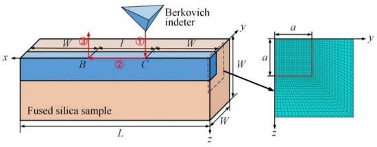 In the finite element model, an infinitely sharp Berkovich edge-forward indenter slides along the x-axis on the top surface of a deformable parallelepiped with a dimension of W × W × (l + 2W), as shown in Figure 2. The diamond indenter is assumed to be rigid because its Young’s modulus [32] and hardness [33] are much higher than those of the fused silica samples [14]. An eight-node linear brick element with reduced integration and hourglass control is used. Refined FE mesh with an element size of le is used in a parallelepiped with a dimension of a × a × (l + 2W), and graded FE mesh is used in the residual region. For conical scratching, the semi-included angle α of the conical indenter is set as 70.3°, to ensure that the projected area-to-indentation depth function is the same as the commonly used Vickers and Berkovich indenters. A = 2.79 hmax is the nominal contact radius for 70.3° conical scratching.