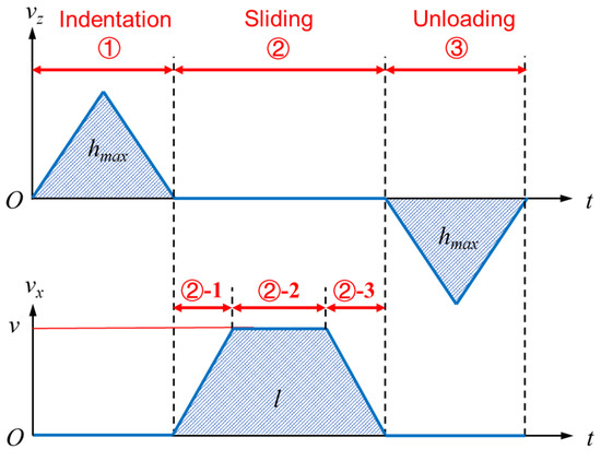 As shown in Figure 2 and Figure 3, the sliding process is divided into three stages, i.e., the indentation stage ①, the sliding stage ②, and the unloading stage ③. The scratching depth, length, and speed are denoted as hmax, l, and v, respectively. The Coulomb friction model is used to model the adhesion friction behavior between the indenter and the sample. The coefficient of adhesion friction f was determined to be 0.04, by comparing FEA and scratching tests.