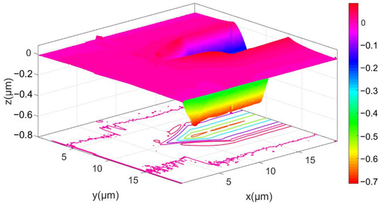 In order to determine the scratching depth directly from the displacement curve, the normal displacement of the indenter (see Figure 1c) during the scratching process was corrected by the original profile of the sample surface. The corrected normal displacement in the scratching stage Ⓓ was calculated by subtracting the uncorrected displacement from t2 to t1 in the stage Ⓑ from the uncorrected displacement from t3 to t4. Similarly, the corrected normal displacement in the postmortem profiling stage Ⓕ was calculated by subtracting the uncorrected displacement from t1 to t2 from the uncorrected displacement from t5 to t6. The evolution of the corrected normal displacement with time is shown in Figure 6. The maximum scratching depth and residual depth are 1063 nm and 479 nm, respectively. It is worth noting that this value of residual depth is smaller than that measure by AFM (i.e., hf = 668 nm). This is possibly because the indenter did not strictly follow the scratching path in stage Ⓕ, due to the movement of the sample or the motion error of the indentation test in the lateral direction. By contrast, the AFM probe accurately detects the lowest positions of the residual scratching profiles for two reasons. First, the tip radius of the AFM probe is much smaller than that of the Berkovich indenter. Second, the AFM probe is scanning across the impression. Using the AFM-measured hf, the elastic recovery ratio is calculated to be fe = 1−hf/hamx = 37.2%. Ba analyzing the FEA-predicted profiles of the scratching impression at the fully-loaded and fully-unloaded states shown in Figure 7, the value of fe predicted by FEA is 37%, which is very close to the experimental value.