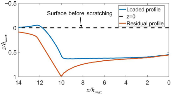 The FEA-simulated profiles of the scratching impression at the fully loaded and fully unloaded states for an edge-forward Berkovich indenter.