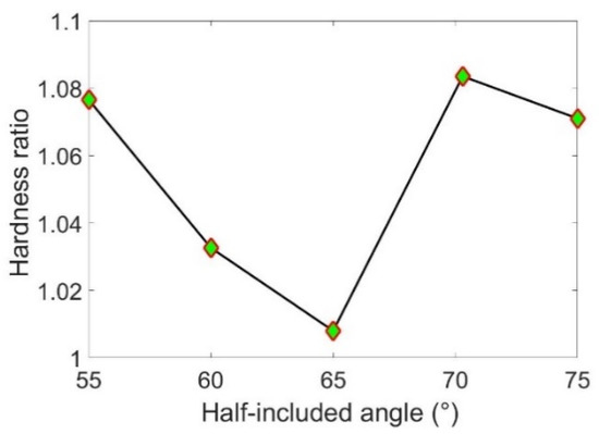 The variation of hardness ratio with the half-included angle of the conical indenters.