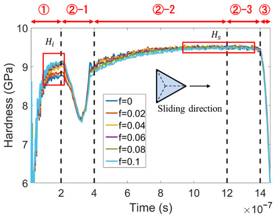 The variation of hardness with time at various values of adhesion friction coefficient f for edge-leading Berkovich scratching.