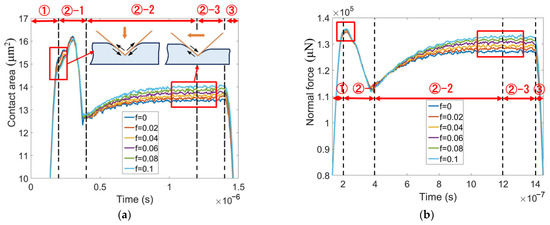 In order to understand the above phenomena, the evolutions of the contact area and normal force with time are plotted in Figure 10a,b, respectively. During the transition from indentation to sliding, i.e., in the stage ②-1, the contact area is considerably reduced because the support for the indenter rear is removed. If no elastic recovery occurs, the rear face of the indenter is entirely separated from the sample surface, and the contact area decreases to two-thirds. However, Figure 10a shows that the contact area during the steady sliding stage (in the right red box) is significantly bigger than two-thirds of that during indentation (in the left red box). This is due to elastic recovery.