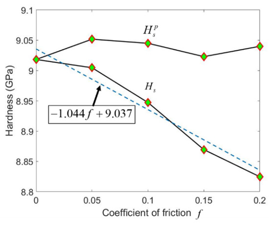 Although the scratching hardness Hs for Berkovich indenter is independent of f, Hs for conical indenter is linearly decreased with f, as demonstrated in Figure 11. The scratching hardness induced by ploughing, i.e., , remains nearly unchanged when f increases from 0 to 0.2.