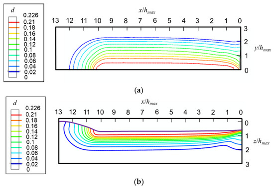 Contours of densification at the fully unloaded state induced by scratching with a 70.3° conical indenter in (a) the top surface and (b) xz-cross-section.