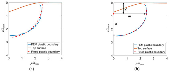 As shown in Figure 13b, the shape of the elastic–plastic boundary is characterized by the length m of the semi-major axis, the length n of the semi-minor axis, and the depth ξ of the elastic–plastic boundary center. The semi-major and semi-minor axes are along the lateral and vertical directions, respectively. These parameters can be determined by fitting the elastic–plastic boundary by the following formula: