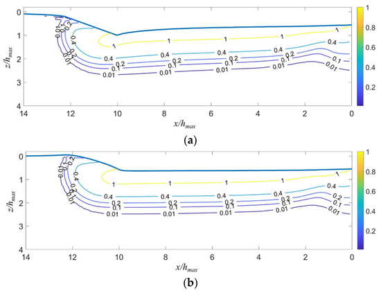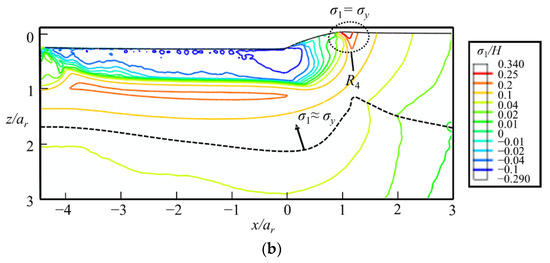 The contours of σ1/H at the (a) fully loaded and (b) fully unloaded states in the xz-cross-section. The thick dash line is the boundary between σ1 ≈ σy and σ1 ≈ σ*, where σ* is the in-plane principal stress.