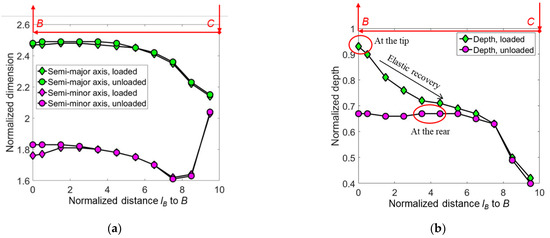 The fitted (a) dimension and (b) depth of the elastic–plastic boundary normalized by hmax. The indenter moves from the point C to the point B in the scratching stage (see Figure 2).