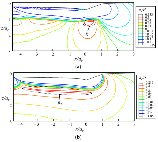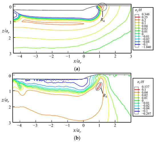 The contours of (a) σy/H and (b) σz/H at the fully unloaded state in the xz-cross-section predicted by FEA. The indenter moves along the positive direction of x-axis.