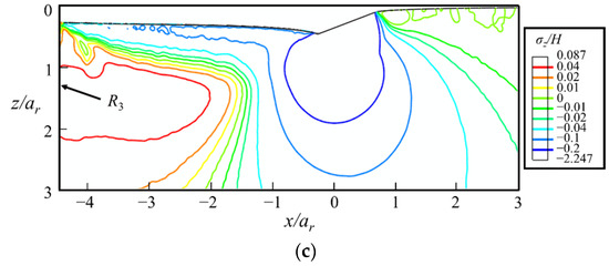 The contours of (a) σx/H, (b) σy/H, and (c) σz/H at the end of the sliding stage ② in the xz-cross-section, where ar = 2.24 hmax is the real contact radius evaluated by FEA, and H is the hardness measured by indentation tests. The indenter moves along the positive direction of the x-axis.