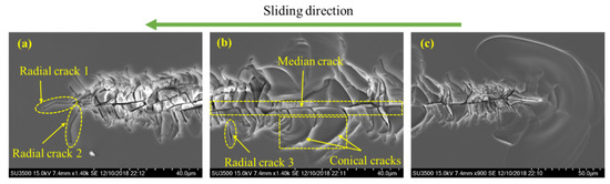 (3) Median cracks along the sliding direction tend to be the first cracks that emerge in the sliding stage. Radial cracks may initiate under a smaller load in the sample surface at the front of the indenter during the unloading stage. Radial and median cracks coalesce to form a big median–radial crack that penetrates through the entire yield region.