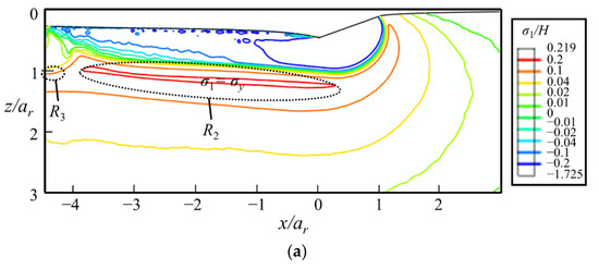 The scratching-induced stress contours under a conical indenter at the end of the sliding stage ② are shown in Figure 16. In the front of the indenter tip, i.e., in the region x ≥ 0, the shape of the contour lines induced by scratching is similar to those induced by indentation [29]. By contrast, at the back of the indenter tip, the contours are flattened, due to the plastic deformation left by the sliding indenter.