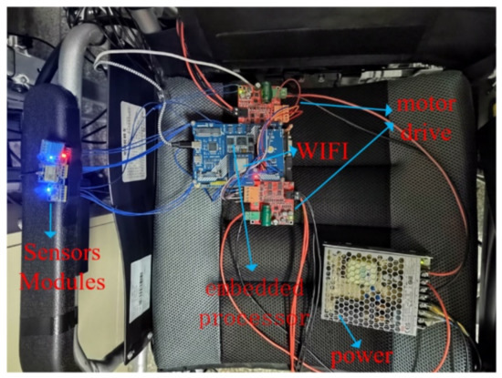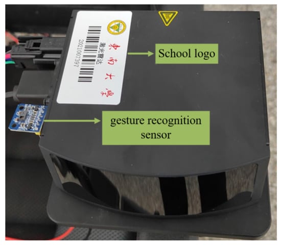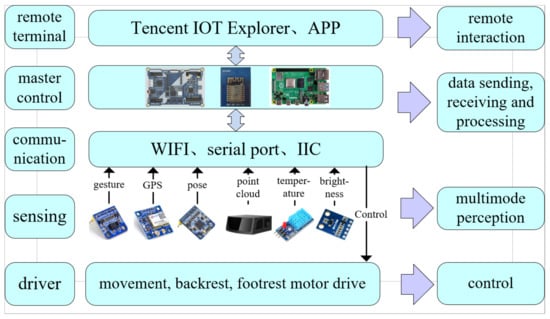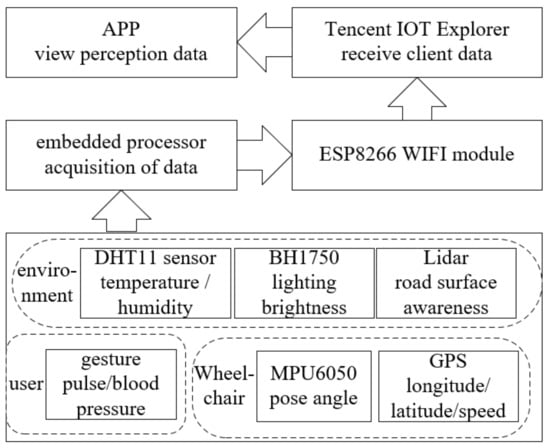 Figure 2. We first proposed a multimode perception technology including occupant perception, state perception and environment perception. To solve problem (1), gesture recognition sensors were installed on the wheelchair and the microcontroller received movement data from the end of the arm using the IIC protocol to achieve gesture perception; for problem (2), we installed MEMS (Micro-Electro-Mechanical System) posture sensors and positioning sensors on the wheelchair to achieve state perception; for problem (3), we installed lidar and weather sensors on the wheelchair and invoked the radar recognition algorithm to collect road information and weather data to achieve perception of the environment.