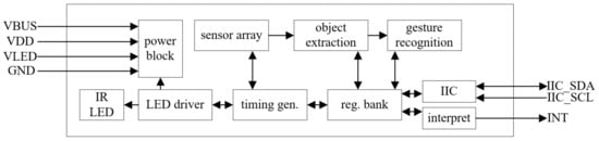 Figure 4. During operation, through the internal LED (Light Emitting Diode) driver, the infrared LED is driven to emit infrared signals outwards. When the sensor array detects an object in the effective distance, the target information extraction array will acquire the characteristic raw data of the detected target, and the acquired data will be stored in the register, while the gesture recognition array will recognize the raw data for processing, and finally store the recognition result in the register, and output the recognition result using the IIC bus.