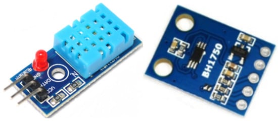 Figure 8, where the DHT11 sensor uses a single bus data format with 8 bit humidity integer data + 8 bit humidity fractional data + 8 bi temperature integer data + 8 bit temperature fractional data in the data packet; the BH1750 sensor uses an IIC(Inter-Integrated Circuit) interface and has a built-in 16 bit AD converter for high accuracy measurement of brightness at 1 lux.