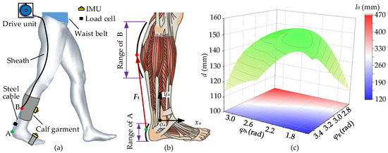 Optimization of anchor locations. (a) A-Suit, for plantar flexion, consists of an exosuit body, a drive unit, and Bowden cables. (b) Biological structures of the gastrocnemius and heel are measured and shaped, where the anchors A and B move along the arcs. (c) The torque arm d and initial length l0 are calculated, with the changes of the angles φh and φg.