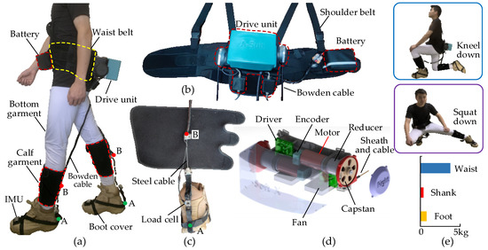 Design and actuation of A-Suit. (a) A-Suit system is composed of the drive unit, Bowden cable, anchor parts, flexible exosuit, and gait detection unit. (b) The drive unit and battery are fixed to the waist belt and placed on the back and front of the body. (c) Anchors A and B are sutured on the calf garment and boot cover, and the load cells are connected in series between the two anchors. (d) The drive unit consists of two traction devices and the steel cables are pulled and released by the capstan. (e) The A-Suit doesn’t affect the natural movements of the human body, and most of the weight is distributed around the waist.