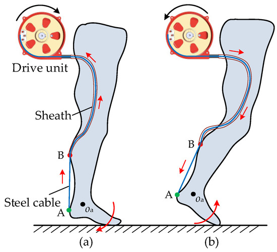 Kinematics of the drive unit. (a) Contraction of the steel cable at the plantar flexion of the ankle. (b) Release of the steel cable at the prophase of the swing phase.