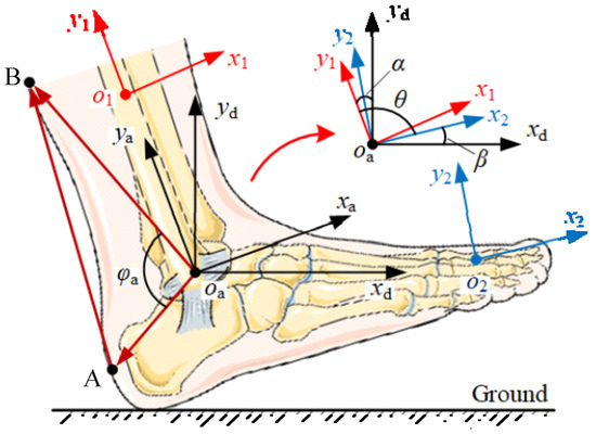 The lower/upper anchors A and B are fixed to the back of the heel and the gastrocnemius surface, respectively. The vector oaA moves with the coordinate x2o2y2 and vector oaB with the coordinate x1o1y1. The included angle φa between the two vectors can be acquired as the following: