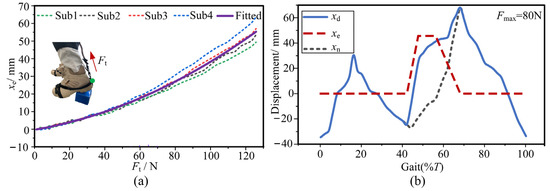 The A-Suit system will generate obvious elastic deformation under the traction force Ft. The transmission efficiency of the auxiliary force is restricted by the total stiffness ktotal of the system. ktotal is mainly composed of the stiffness of the A-Suit body, local soft tissues, and the steel cable. The method of experimental measurement is adopted to calculate the stiffness ktotal [26]. The traction force Ft is continuously applied to the ankle joint from 0 N to 120 N through the drive unit at the standing posture. Meanwhile, the ankle produces the corresponding resistance and keeps relatively stationary. The elastic displacement xe of the Bowden cable was measured and recorded by a displacement sensor. Based on the collected data of xe, four real curves were formed and plotted, shown in Figure 6a. The fitting curve of the forces and displacements is the average value of the four measurement curves. The stiffness ktotal was calculated with OriginPro software. Hence, the expression of ktotal can be fitted: