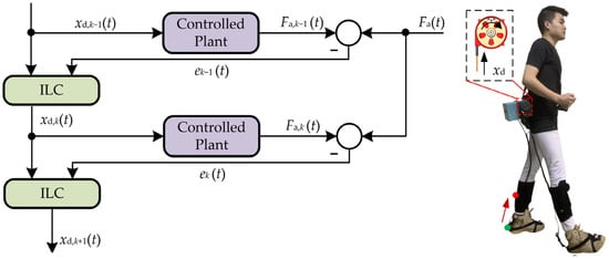 Due to the hysteresis effect, the dynamic asymmetry of the one-way transmission and nonlinear coupled problems of Bowden cables [35], delays of dynamic response and unknown jitters may occur during the assistance process. It is difficult to realize the high-accuracy force-position control of the drive unit. For solving the above problems, an ILC strategy was proposed according to the periodicity of human gait [36,37]. An iterative learning law was constructed to correct the control variable xd,k(t) at current moments by continuously learning the historical errors of the output forces [38]. The traction displacement xd,k of the drive unit at the kth gait cycle is taken as the input and the auxiliary force Fa,k as the output. The displacement xd,k is adjusted constantly based on the historical errors. The auxiliary profile of the traction force Fa,k can be converted quickly to the ideal profile of Fa.