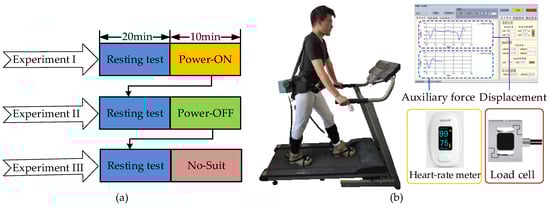 Scheme and platform of assistance experiments. (a) The volunteers rested for 20 min before the test and walked in the state of Power-ON, Power-OFF, and No-Suit for 10 min. (b) The volunteers walked on the treadmill at three different speeds and heart rate, auxiliary force, and displacement data were measured and depicted in the visual interface.