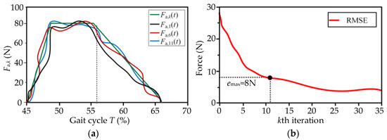 The preset displacement xd,0 was taken as the initial input of the control unit. The control variable xd,k(t) of ILC was constantly modified via iteratively learning the errors ek(t) of Fa,k. At the kth gait cycle, the input displacement xd,k and the output force Fa,k were measured and recorded in the control unit. The results of the experiments for the moderate speed V2 = 1.25 m/s (experimental data of subject No.1) are shown in Figure 9a. The iterative force Fa,k at the kth gait cycle approaches the desired profile of Fa gradually between the 11th~15th iterations, and the relative errors between Fa,k and Fa are limited to the maximum allowable output error emax. The actual input displacement xd,k was continuously changed under the effect of ILC. In the assistance stage, the real displacement xd,k of the drive unit can allow smooth changes during walking assistance, and the errors of Fa,k occur mainly due to the stiffness discrepancies and the elastic hysteresis of the exosuit body. The root mean square error (RSME) of kth iteration decreased with the number of iterations, as shown in Figure 9b. The force Fa,k was able to track the profile of the desired auxiliary force Fa quickly. From the perspective of usability, the equipment can understand the movement characteristics of the lower limbs, and the movement fluency between the human and the machine is continuously improved. The subjects obviously felt the process to be labor-saving.