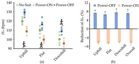 Changes in heart rates Hav over different inclines (V2 = 1.25 m/s). (a) The heart rates Hav of the four subjects over Uphill terrain (+10°), Flat, and Downhill terrain (−10°) are depicted clearly. Translucent circles are the values for each individual subject; opaque contoured circles indicate the mean over the subjects. There are no outliers identified by Thomson tau analysis. (b) A-Suit can be applied to walking uphill and downhill. The overall reduction of Hav for Power-ON is 13.4% ± 1.94% compared with that of Power-OFF. Black cycles indicate a significant difference from 0.