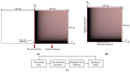 The simulation model of a picosecond laser heating silicon has been established, as shown in Figure 1. The laser beam in the optical path is a three-dimensional axisymmetric Gaussian beam, and the free electron concentration, electron and lattice temperature inside the material are rotationally and symmetrically distributed along the z axis. In order to improve computational efficiency and resources, the model was simplified to an r-z two-dimensional plane model. The length and width of the model were 100 μm; the initial temperature was 300 K; no constraint was imposed on the symmetry axis; the incident boundary considered the thermal radiation; and the remaining two boundaries adopted adiabatic boundary conditions, as shown in Figure 1a. Considering the accuracy and efficiency of the calculation, the grid type was set as a free quadrangle grid that was controlled by the user and calibrated as a refined semiconductor. In meshing, the geometric sequence increased along the negative direction of the r-axis and the z-axis, and the analysis domain was refined into a rectangular grid for discretization and solved at the element node, as shown in Figure 1b. In the simulation, the single pulse energy was 25 μJ; the laser wavelength was 1064 nm; the pulse widths were 15 ps, 12.5 ps, 10 ps, 7.5 ps, 6 ps and 5 ps; the analysis time step was 0.1 ps; and the total time step was 100 ps.