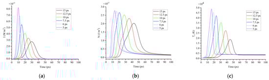 Fourth, the lattice temperature reached a maximum when tp was around 7.5 ps. When tp = 15 ps, the maximum free electron concentration was 2.02 × 1027 m−3, the electron–lattice relaxation time was 2.96 ps, the electron–lattice temperature reached equilibrium state at around t = 55 ps, and the laser pulse ended at t = 60 ps. Therefore, the lattice could be sufficiently heated, but the maximum electron temperature was low and the energy that was obtained by the lattice was also small. The maximum lattice temperature was 3200 K, as shown in Figure 4a. When tp was shortened to 7.5 ps, the maximum free electron concentration was 2.65 × 1027 m−3, the electron–lattice relaxation time was 4.92 ps, the electron–lattice temperature reached an equilibrium state at around t = 30 ps, and the laser pulse ended at the same time (t = 30 ps). Therefore, the lattice could be sufficiently heated and the higher electron temperature enabled the lattice to reach a higher temperature. The maximum lattice temperature was 3862 K, as shown in Figure 4a. When tp came to 5 ps, the maximum free electron concentration was 2.76 × 1027 m−3, the electron–lattice relaxation time was 5.31 ps, the electron–lattice temperature reached equilibrium state at around t = 22 ps, and the laser pulse ended at t = 20 ps. Although the electron temperature was the highest in this condition, the lattice could not be heated sufficiently, and the maximum lattice temperature decreased to 3749 K, as shown in Figure 4a. Therefore, when the pulse width was 5 to 15 ps, the maximum lattice temperature tended to increase first and then decrease with the decreasing pulse width, with a peak near tp = 7.5 ps, as in Figure 4b.
