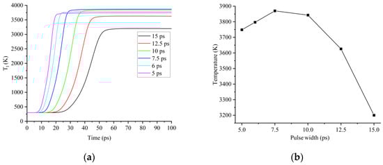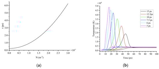 Third, the time that it takes for free electrons to transfer energy to the lattice, known as electron–lattice relaxation time, is on the order of a picosecond. The electron–lattice relaxation time is a function of the free electron concentration, calculated by = (fs) [19,30], and it increases with an increasing electron concentration, as shown in Figure 3a. The prolongation of the electron–lattice relaxation time leads to a longer time for the electron–lattice temperature to reach an equilibrium state. The lattice can be sufficiently heated when the electron–lattice temperature reaches an equilibrium state before the end of laser pulse, but the lattice cannot be sufficiently heated when the electron–lattice temperature reaches the equilibrium state after the end of laser pulse. The times for the electron–lattice temperature to reach an equilibrium state under the action of picosecond lasers with different pulse widths are shown in Figure 3b.