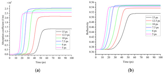 (a) Variation characteristic of absorption coefficients; (b) variation characteristic of reflection coefficients under the action of picosecond lasers with different pulse widths as 15 ps, 12.5 ps, 10 ps, 7.5 ps, 6 ps and 5 ps.