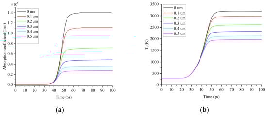 Sixth, within 50 ps, vaporization and ablation of the silicon surface began to occur. In the simulation, when J = 25 μJ and tp = 15 ps, the evolution of the absorption coefficient at different depths inside the silicon occurred, as shown in Figure 6a. The maximum absorption coefficient of the silicon surface was 1.4 × 107 m−1, and the laser energy was rapidly absorbed within tens of nanometers on the silicon surface. The absorption coefficient decreased rapidly with an increasing depth. Due to the absorption of the laser energy by the silicon, the laser energy density decayed rapidly with an increasing depth. Therefore, the lattice temperature was the highest at z = 0, as shown in Figure 6b.